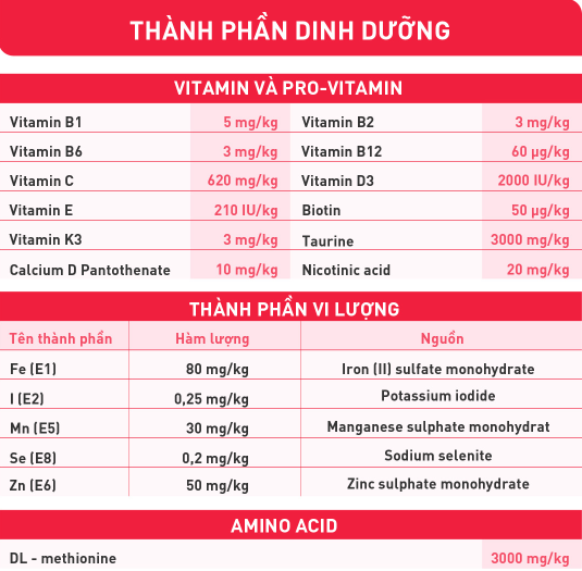 Phụ gia dinh dưỡng: Vitamin A 25000 IU/kg, vitamin B1 5 mg/kg, vitamin B2 3 mg/kg, vitamin B6 3 mg/kg, vitamin B12 60 μg/kg, vitamin C 620mg/kg, Vitamin D3 2000 IU/kg, vitamin E 210 IU/kg, biotin 50 μg/kg, vitamin K3 3 mg/kg, taurine (3a370) 3000 mg/kg, calcium-D-pantothenate 10 mg/kg, nicotinic acid (3a314) 20 mg/kg, Sắt (E1) 80 mg/kg, I ốt (E2) 0,25 mg/kg, Mangan (E5) 30 mg/kg, Selen (E8) 0,2 mg/kg, Kẽm (E6) 50 mg/kg, DL-methionine (3c301) 3000 mg/kg - Chất chống oxi hóa.