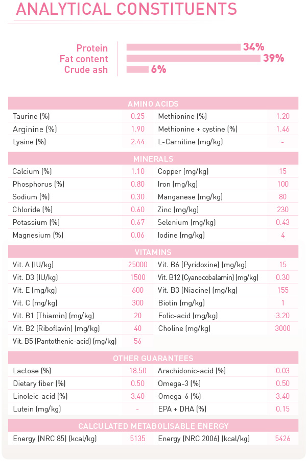 Phụ gia dinh dưỡng: Vitamin A, Vitamin D3, E1 (Sắt), E2 (I ốt), E4 (Đồng), E5 (Mangan), E6 (Kẽm), E8 (Selen), Taurine - Chất chống oxi hóa.